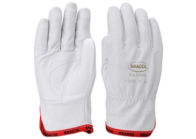 Luvas de segurança, confeccionadas em vaqueta, com reforço interno na palma e elástico no dorso do punho.